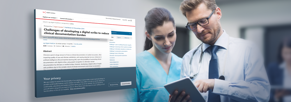 npj Digital Medicine is an open-access, international, peer-reviewed journal in the Nature family of journals. It is dedicated to publishing the highest-quality research relevant to all aspects of digital medicine and health. In November 2019 it published a still-timely perspective piece on the Challenges of Developing a Digital Scribe to Reduce Clinical Documentation Burden. Here’s an excerpt from the abstract: